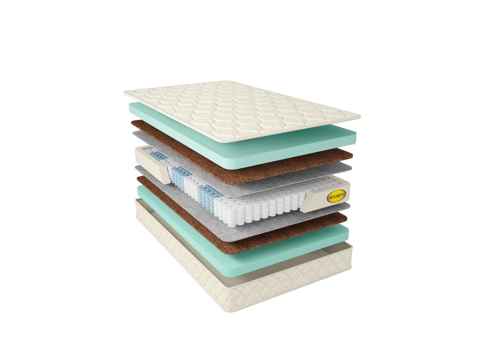 Порядок наполнителей не случаен. Сразу за пружинным блоком следует кокосовая койра. Благодаря своей высокой жёсткости и плотности она отлично передаёт и продолжает ортопедические особенности пружин. Толстый слой латекса, следующий за койрой, обеспечивает комфорт и приятную упругость. Материал дает поверхностям эластичность и адаптивность, которые позволяют повторять все изгибы тела.