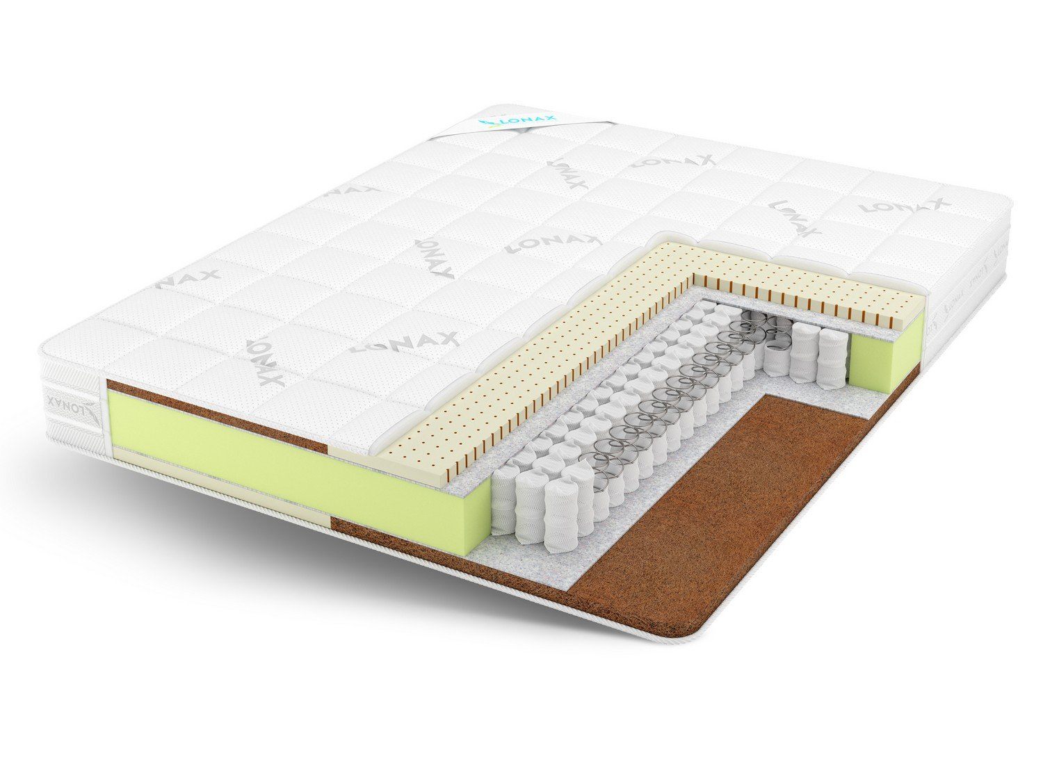 Матрас с абсолютно разной жесткостью сторон. Одна сторона матраса высокой жесткости, за счет добавления кокосовой койры (3см). Это природный материал, представляющий собой волокна ореха кокосовой пальмы, пропитанные составом из натурального латекса. Прочная и долговечная, кокосовая койра хорошо пропускает воздух, обладает антибактериальным эффектом и не вызывает аллергии. Другая сторона матраса низкой жесткости, благодаря латексу — натуральный упругий и эластичный материал на основе сока каучукового дерева гевеи. Отличается особой комфортностью и повышенной износостойкостью, способен выдержать большое давление и быстро восстанавливает первоначальную форму. В основе модели лежит блок независимых пружин TFK (~256 пр./м2), который обладает выраженными ортопедическими свойствами. Матрас прекрасно подойдет парам с большой разницей в весе (более 30 кг). Чехол матраса выполнен из бельгийского жаккарда, простёганного материалом на основе хлопка.