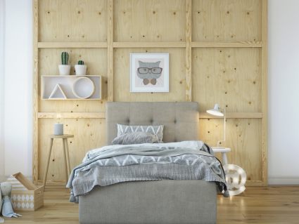 Компактная кровать «Сабина» с мягким изголовьем, декорированным стежкой «квадрат», идеальный вариант для интерьеров в современном стиле или малогабаритных квартир.