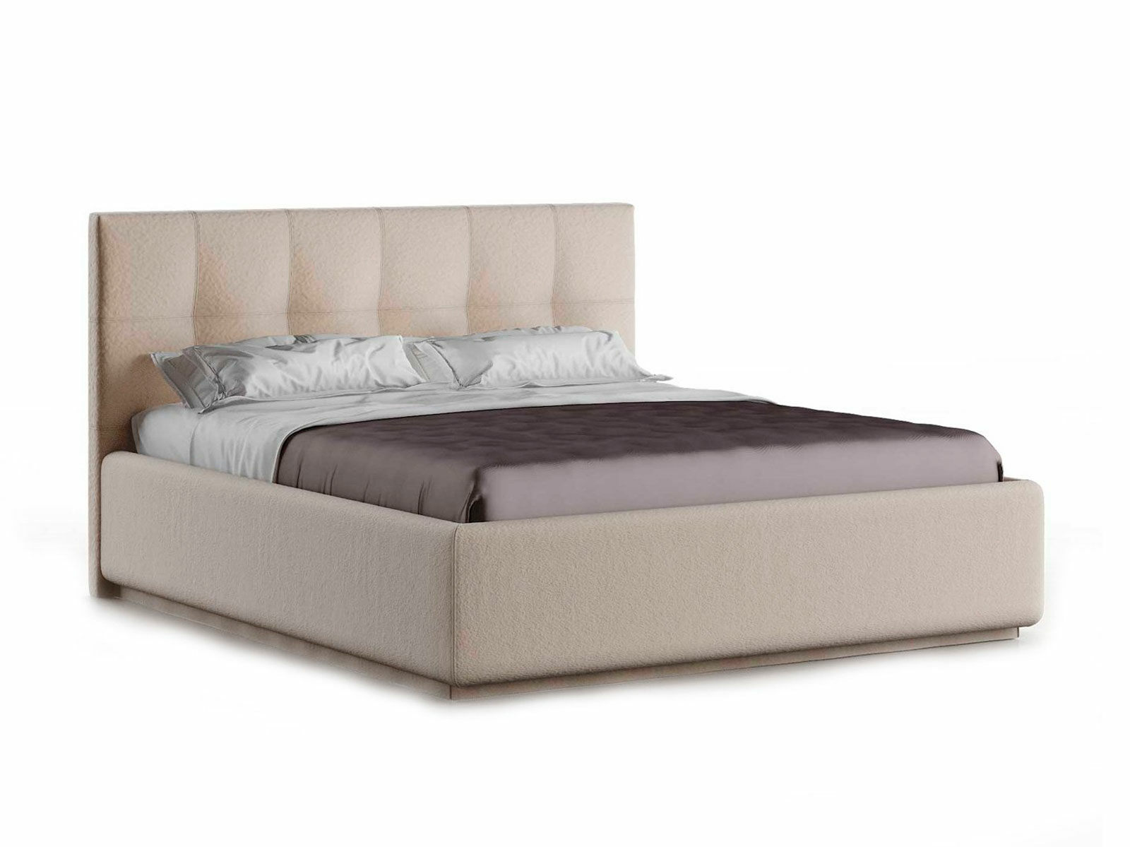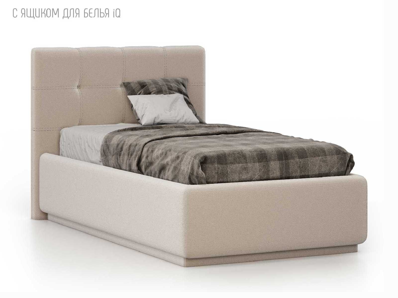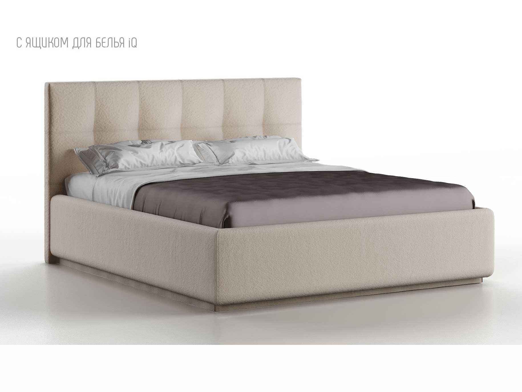 Кровать укомплектована IQ с подъемным механизмом и ящиком для белья без дна (дополнительная платная опция - дно к ящику IQ из HDF (ХДФ). Каркас кровати на цоколе, декоративный чехол на цоколе съёмный. Глубина ящика для белья - 30 см, без ограничения нагрузки на ящик.