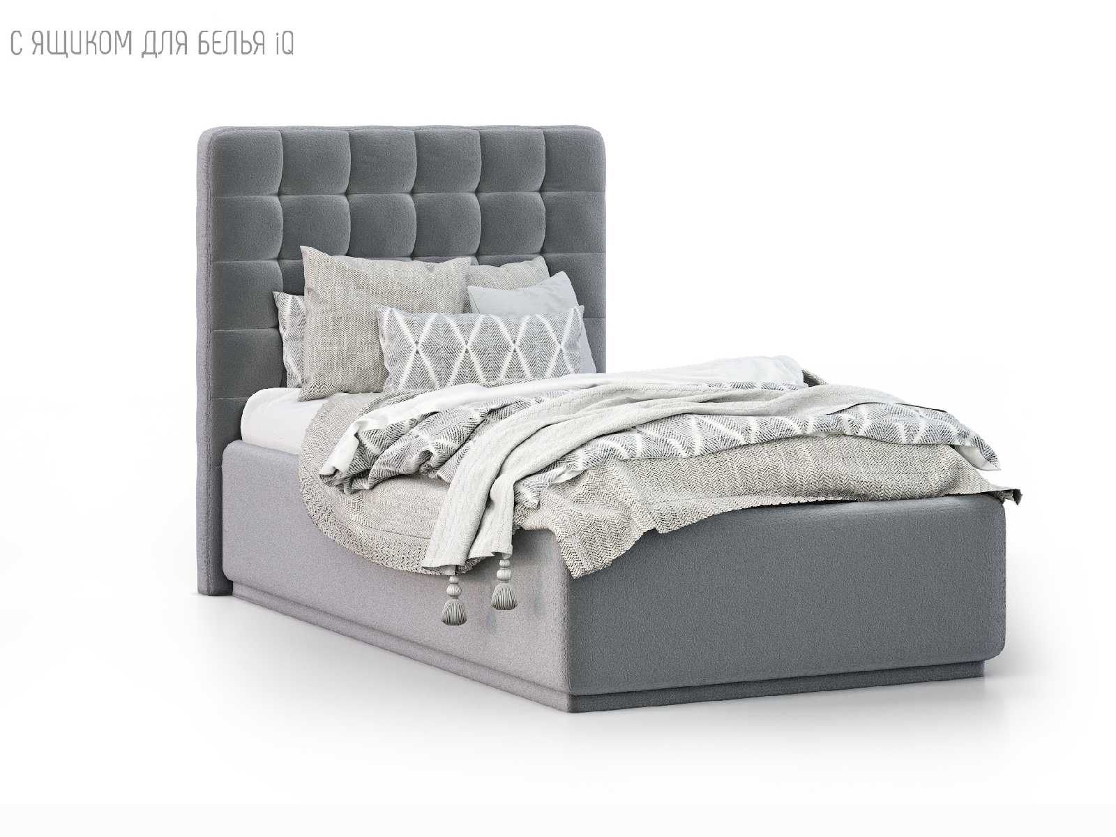 Кровать укомплектована IQ с подъемным механизмом и ящиком для белья без дна (дополнительная платная опция - дно к ящику IQ из HDF (ХДФ). Каркас кровати на цоколе, декоративный чехол на цоколе съёмный. Глубина ящика для белья - 30 см, без ограничения нагрузки на ящик.