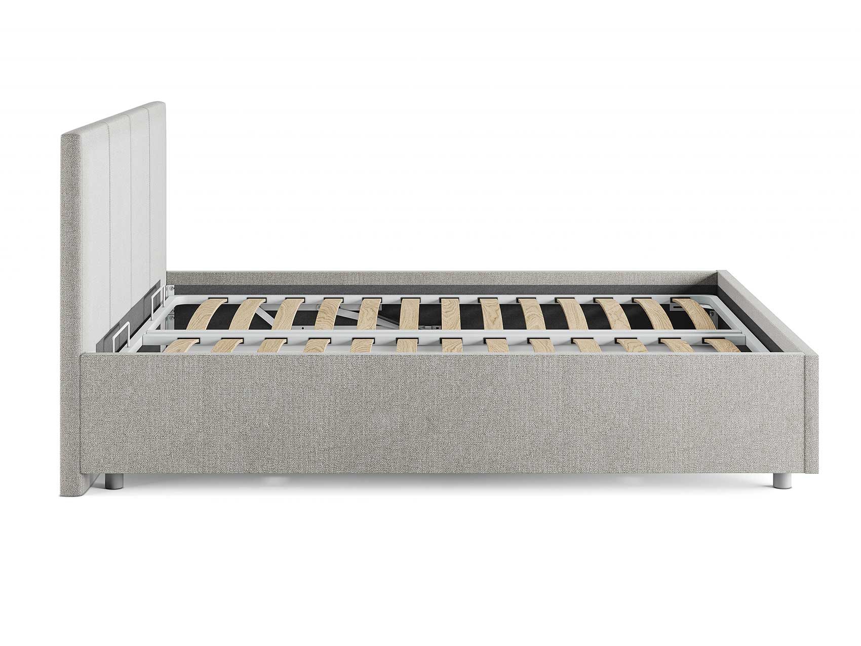 Кровать комплектуется металлическим основанием (без опор), которое имеет 13 рядов встроенных березовых ламелий на каждое спальное место, обеспечивая равномерное распределение нагрузки.