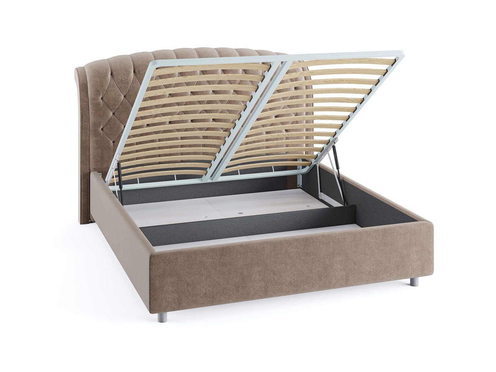 Кровать комплектуется металлическим основанием и подъемным механизмом со вместительным бельевым ящиком. Дно бельевого ящика легко сдвигается для обеспечения уборки под кроватью.