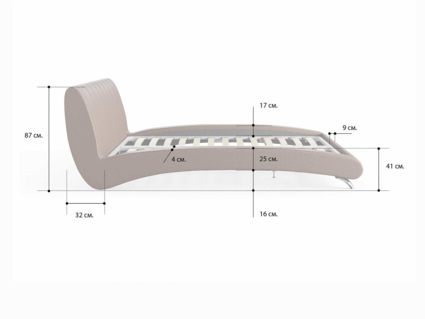 Элегантная интерьерная кровать с мягкой спинкой. Модель изготовлена из ДСП. Обратная сторона изголовья обита спандбондом, но, при желании, её можно выполнить из основного обивочного материала.