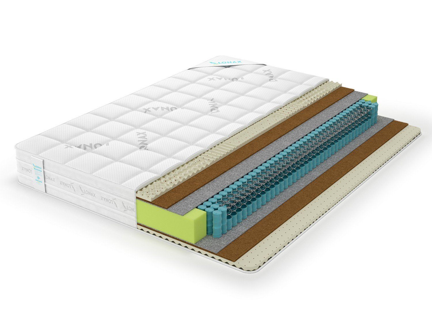 Для обивки матраса реализован прочный двойной жаккард с красивым фирменным принтом Lonax. Ткань отличается прочностью, пропускает воздух и отлично защищает изделие от пыли и внешних загрязнений.