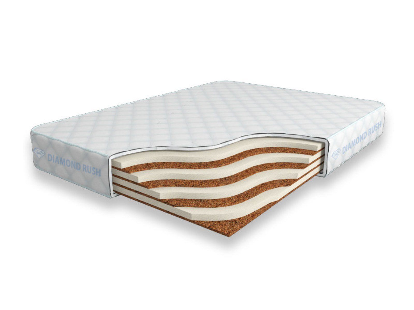 Матрас Diamond Rush Mix Cocos 16 SD является беспружинным, т.е. не имеет в своей основе пружинного блока. В его состав входят одно или несколько чередований слоев латексированной кокосовой койры (1см) и искусственного латекса (3см). Такая модель матраса обладает средним ортопедическим эффектом и имеет разные по жесткости стороны. В верхней части череда материалов завершается жестким наполнителем, который гарантирует соответствующую упругость поверхности, а в нижней – умеренно мягким, поэтому поверхность характеризуется средней степенью жесткости.