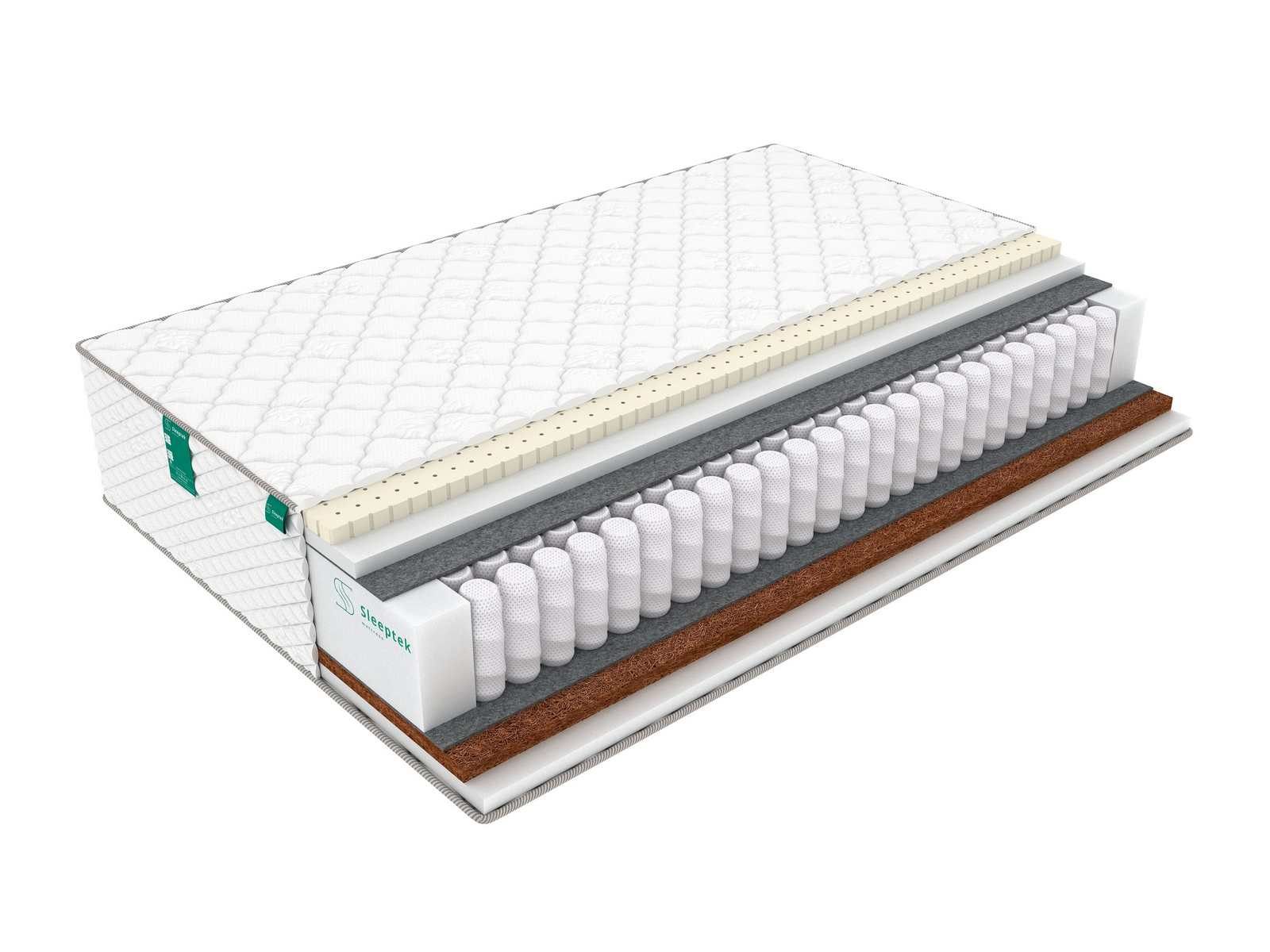 Блок пружин отделен от наполнителей изолирующими слоями термовойлока. Этот плотный материал защищает наполнители от контакта с пружинами и продлевает срок эксплуатации матраса.
