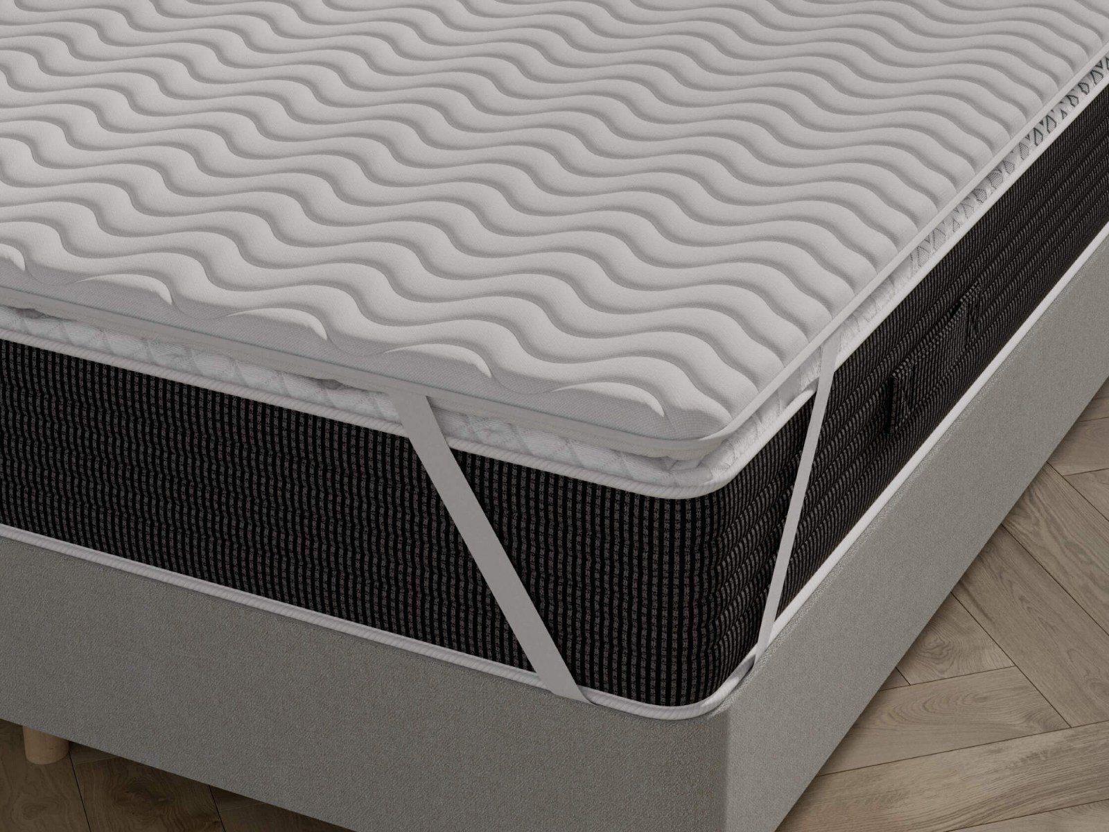 Топпер изготавливается из натуральной кокосовой койры. Этот материал обладает высокой жёсткостью, прочностью и долговечностью. Он подходит для выравнивания неровных поверхностей и обеспечивает дополнительную жёсткость. Крепление осуществляется с помощью резинок по четырём углам. Чехол выполнен из натурального хлопка.