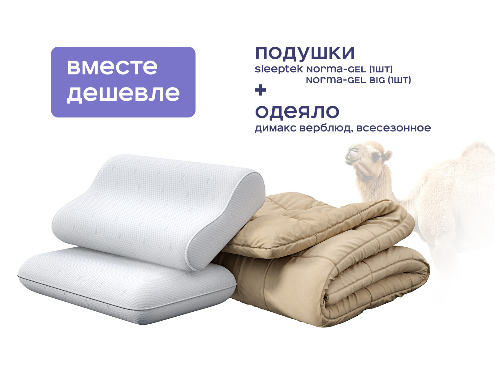 Комплект одеяло Димакс Верблюд всесезонное + подушка Sleeptek Norma-GEL 1 шт. + подушка Sleeptek Norma-GEL BIG 1 шт. Комфортный отдых сразу для двоих с выгодой до 39%. Представьте, что ваша спальня превращается в тропический отель, где каждая ночь — это путешествие в расслабление для вас и вашего партнера. Этот комплект создан для тех, кто ценит здоровый сон и комфорт: одеяло из верблюжьей шерсти согреет даже в самые холодные дни, а две подушки Sleeptek Norma-GEL и Sleeptek Norma-GEL BIG подарят ультра-поддержку пены мемори. Вместе они работают как система, которая бережёт ваш сон.
