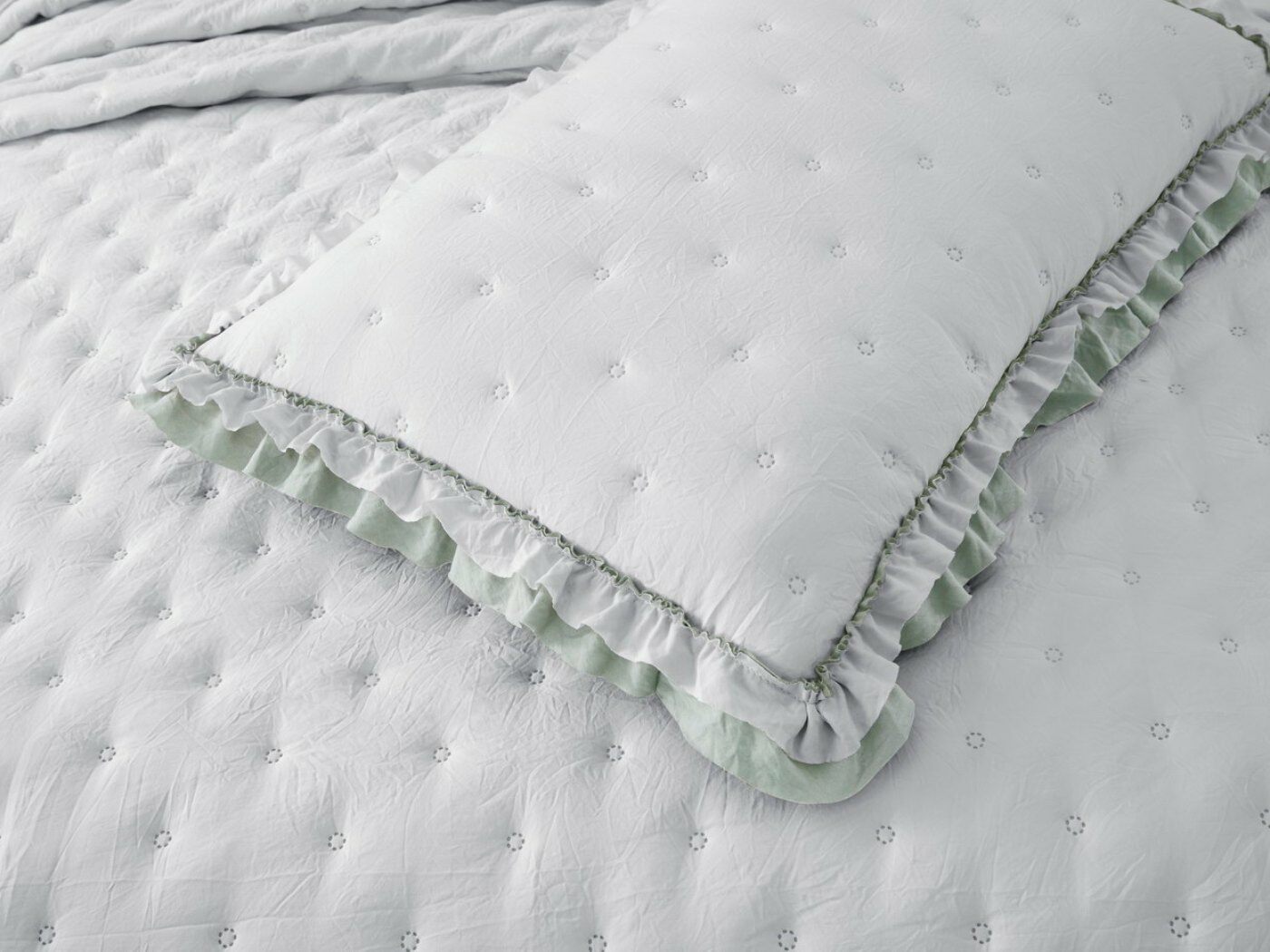 Покрывала выполнены в десяти оттенках, они подойдут для различных интерьеров, объединяет коллекцию потрясающее качество и приятный внешний вид. Изделия декорированы рюшами по краю, что подчеркивает из красоту и изысканность.