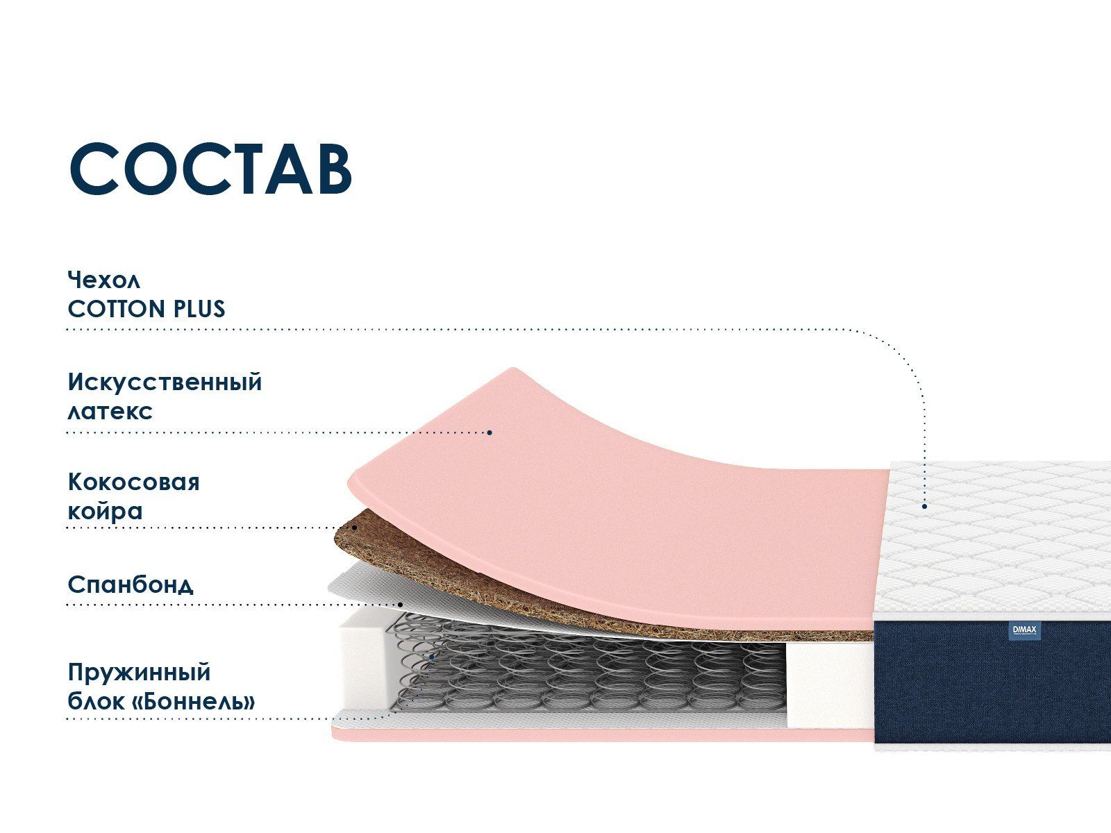 Матрас поставляется в несъёмном хлопковом чехле. Жаккардовое полотно простёгивают на мягком ППУ. В результате у спальных поверхностей получается красивый объём. Боковая часть матраса сшита из рогожки.